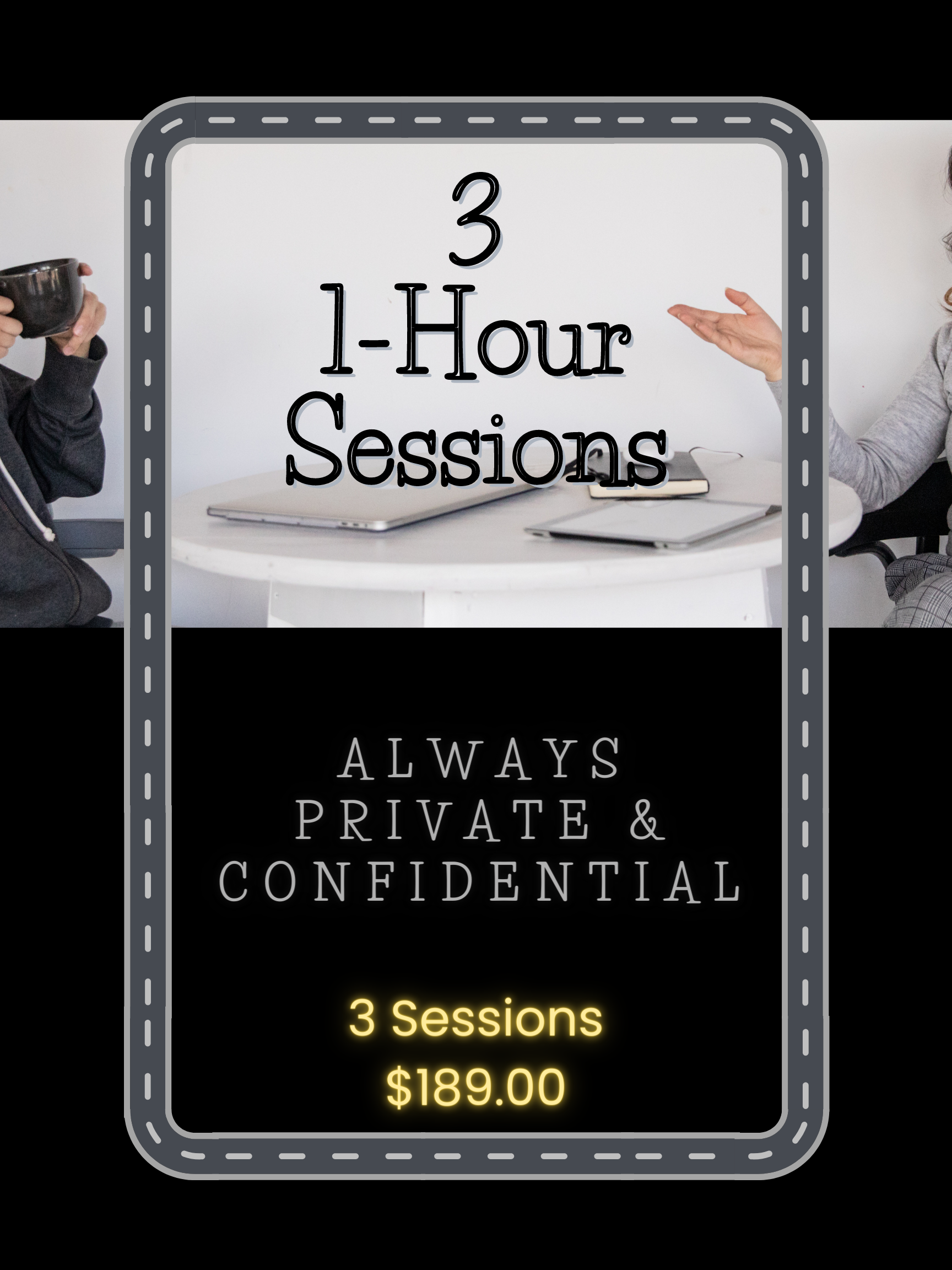 30% discount on 3 sessions (Normally $90 per session.) Save $81 on 3 sessions.